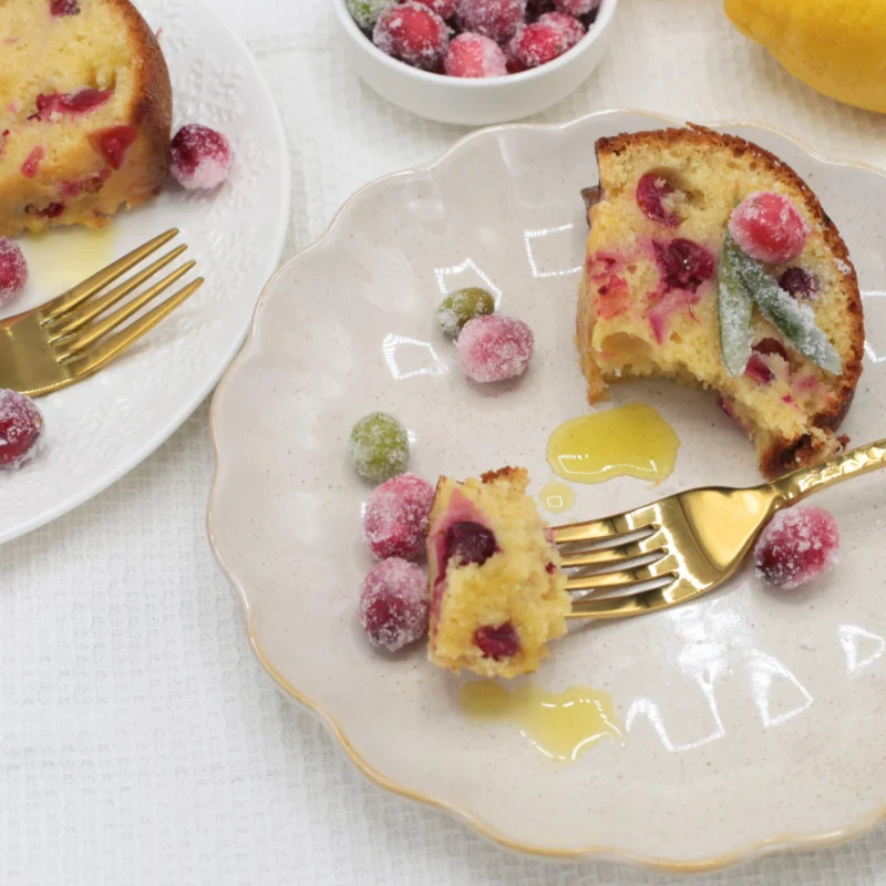 View Recipe Celebrate the season with this festive cranberry cake. Made with fragrant lemon olive oil, fresh lemon zest, and a splash of dessert wine (or orange juice for a non-alcoholic twist), this moist, delicious cake is an elegant centerpiece for your holiday table. Top it with sparkling candied cranberr...