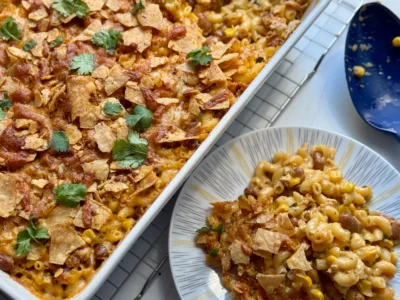 - Bump the oven temperature to 375F and line a large baking sheet with aluminum foil. Place a layer of chips down, followed by a layer of beef, the corn and black beans, and cheese, and repeat this process once more. Bake the nachos for 20 minutes at 375F until the cheese is melted and everything is lightly browned. Top with the avocado and cilantro, as well as any additional favorite nacho toppings and serve warm!