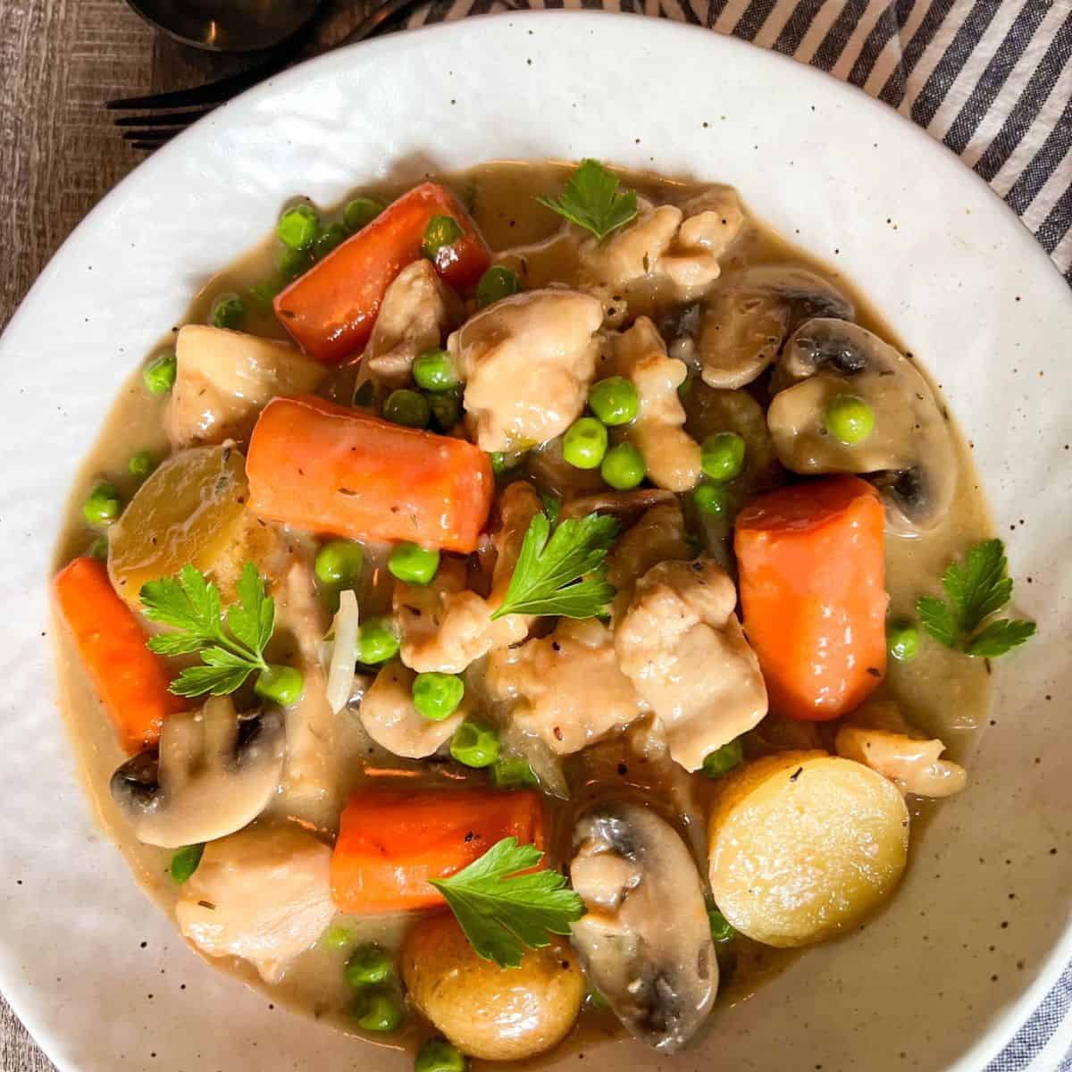 This delicious creamy chicken stew is a big ole pot of comfort food! No missing out on veggies here with creamy baby potatoes, carrots, mushrooms, peas and onions you are getting a hearty plateful! Go ahead and smash those potatoes to get every last drop of the creamy sauce. Of course you could just eat this with a spoon too! The chicken is bite sized and tender as can be. The whole family is going to love this one and head for seconds!