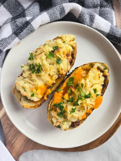 - Once your taters are ready, transfer the tray carefully to a wire cooling rack. Using a slotted spoon, spoon your hot beans around the tray followed by sprinkling your aged marble all over. Return the tray to the oven for a couple of minutes until the cheese is melty. Transfer the tray back to your wire rack.
