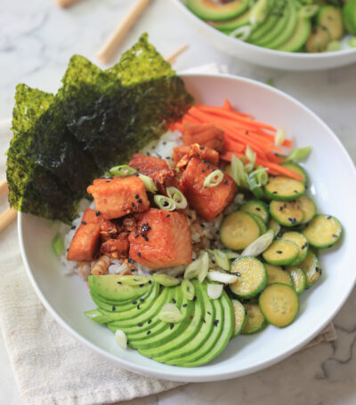 - Cut nori rolls in half and lay on a flat surface. Layer on cooked rice, salmon mixture, cucumber, carrot, and avocado. Sprinkle with Spicy Everything Bagel Seasoning.