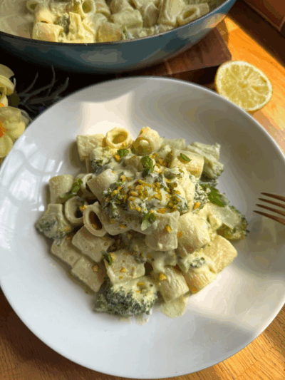 - 5)Cook pasta until al dente, before draining then adding 150ml of the water to the main pot.