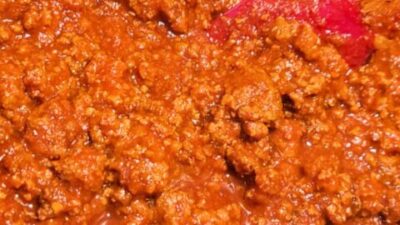 - Pour the meat sauce mixture over the noodles in the casserole pans.