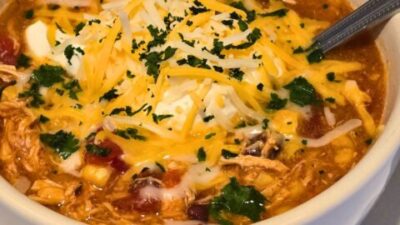 - Remove the casserole pan and top with nacho cheese tortilla chips.