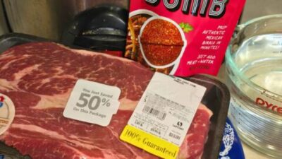 - Drain grease from hamburger when cooked and then add tomato sauce and taco seasoning