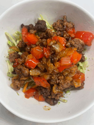 - Cook meat until there’s no pink, drain any excess fat, add in your red pepper and garlic and season with salt and pepper.