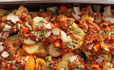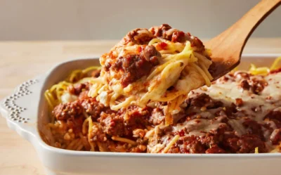 - Preheat your oven to 400°F. Spread that reserved 1/2 cup of marinara on the bottom of a 9x13-inch dish. Add a layer of zucchini slices, half the meat sauce, dollops of the ricotta mix, and sprinkle on some mozzarella and fresh herbs.