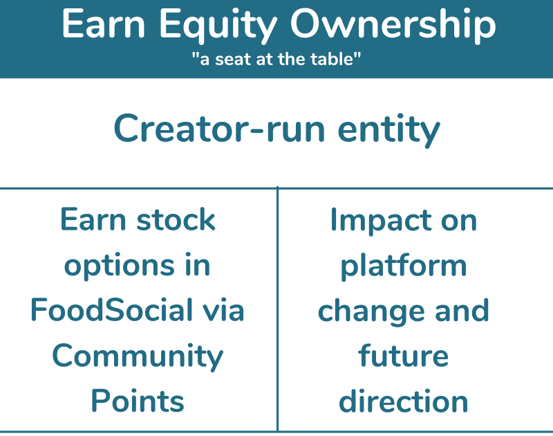 FoodSocial is creator-run, which means that the platform development and decision making process is always guided with creator input. We give creators a seat at the table and a chance to earn equity in FoodSocial. While that type of participation is welcomed, it is not required.